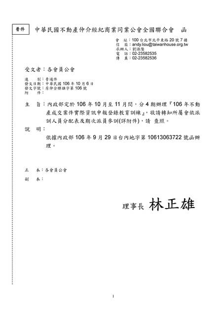 檔案下載(1061011(054)各會員公會-(106年度實價登錄教育訓練).doc)