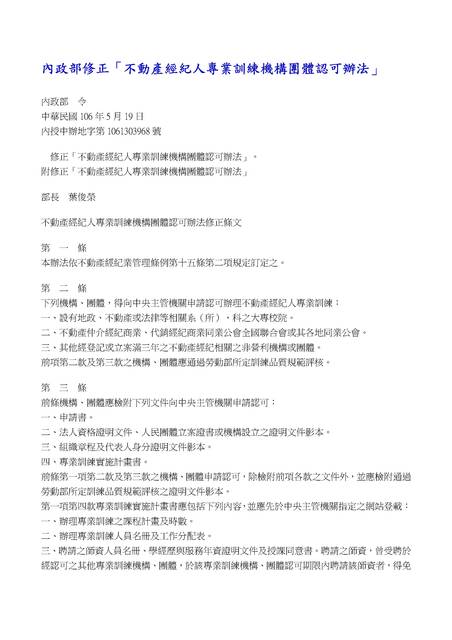 檔案下載(內政部修正「不動產經紀人專業訓練機構團體認可辦法」.docx)