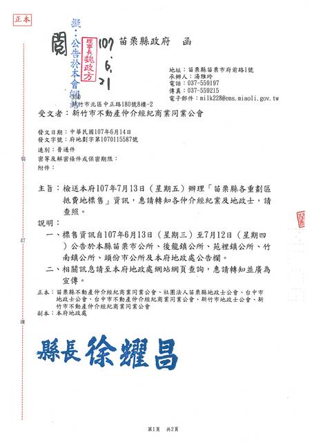 » 函轉苗栗縣政府107年7月13日(星期五)辦理苗栗縣各重劃區抵費地標售資訊,敬請查照
