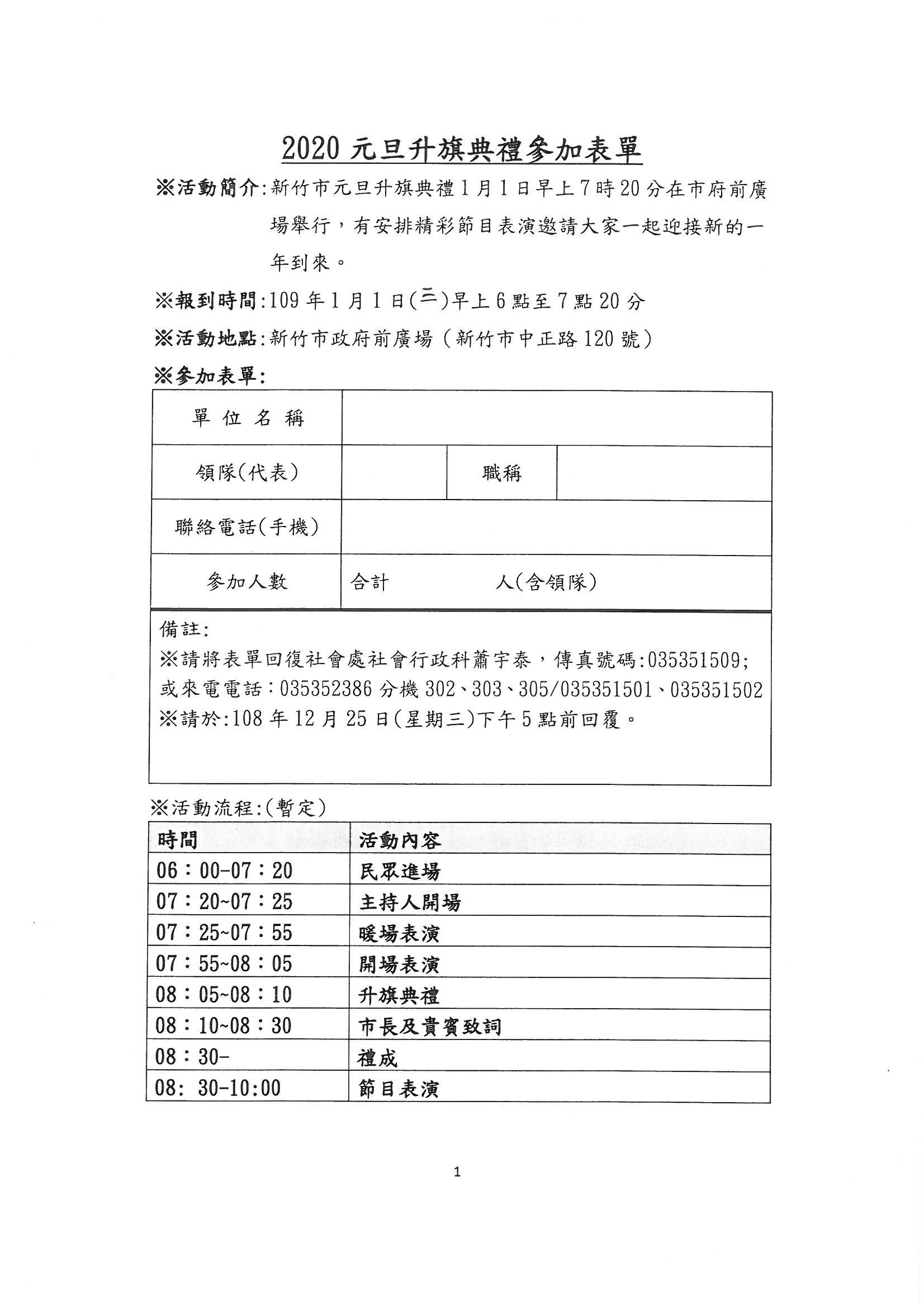 » 市政府訂於109年01月01日上午7時20分,於市府前廣場辦理2020年元旦升旗典禮,敬請會員公司踴躍參加,